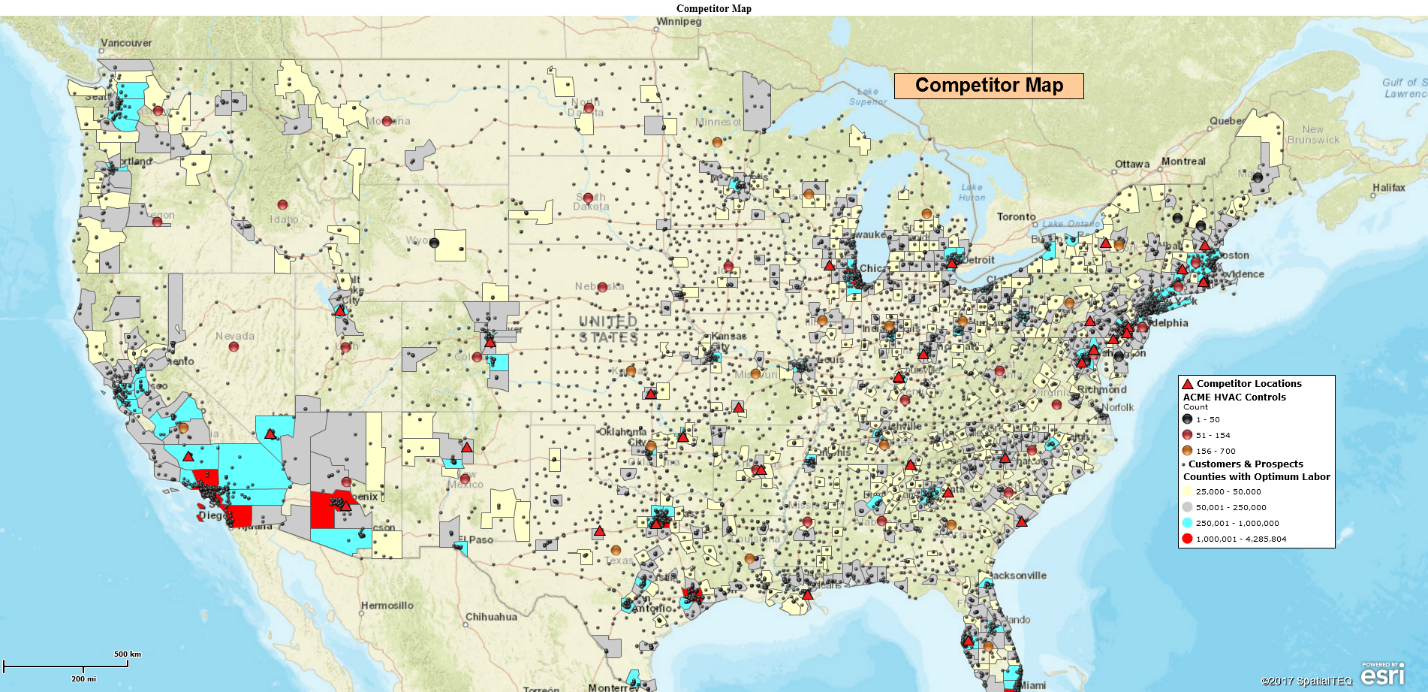 Problem: To adequately assess the HVAC market place Acme HVAC Controls needs to visualize exactly where all competitors are currently located and their general sales coverage areas. It would be helpful to view all current Acme customer locations (with sales values) as well as some of the more lucrative target accounts Acme hopes to win over through their expansion effort. In short, Acme requires a competitor map.