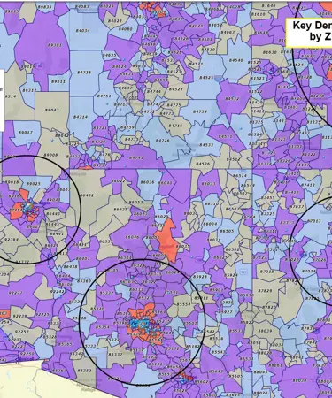 Create color-coded ZIP code maps that enhance strategic planning and analysis through data visualization. Use these maps to conduct business analysis that compares Census demographic data at your business locations.