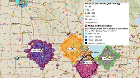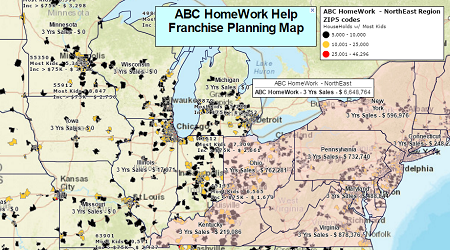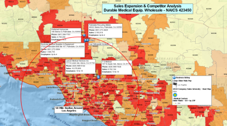 MapBusinessOnline is a versatile tool for creating maps for analysis and strategic planning. MapBusinessOnline can generate detailed U.S. and Canada map images and overlaying them with your sales records and other business intelligence, as well as third-party demographic and marketing data.