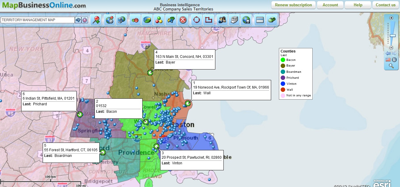 To make sure sales activities take place in a timely fashion, sales territory accountability can be assigned using web maps. Nothing outlines accountability for sales better than a color-coded area on a web map. Whether the plan calls for state, county or zip-code level activity, common web mapping tools will display sales zones with absolute clarity making sure inside and outside sales people know where their activities will be focused and who is held accountable.