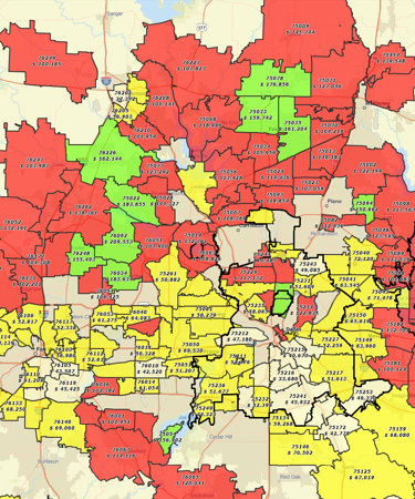 A ZIP code heat map – a type of a color-coded map – is a terrific way to visualize the demographic data by ZIP code. It lets you assign color shades to particular ranges of population, income or other demographic value of interest, to distinguish the ZIP codes where the value is higher from those where the value is lower, “cold” to “hot” (hence the term “heat map”).