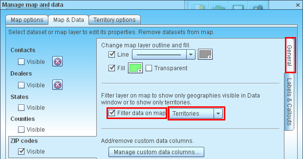 This article describes how to filter a map layer to show only geographies that belong to a territory. Related article: Highlight a market area on a map.